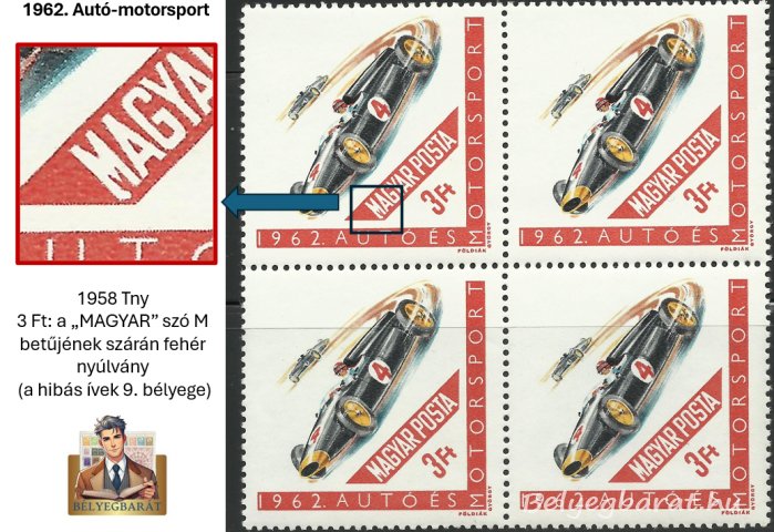 - 3 forintos érték: a „MAGYAR” szó M betűjének szárán fehér nyúlvány (a hibás ívek 9. bélyege)