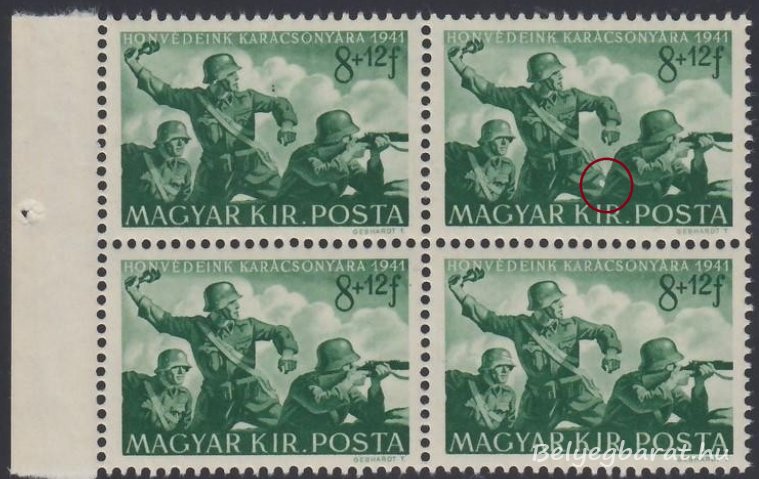 - A 8(+12) filléres címlet ívének 6. bélyegén fehér folt látható a katonán – Tévnyomat megtekintése