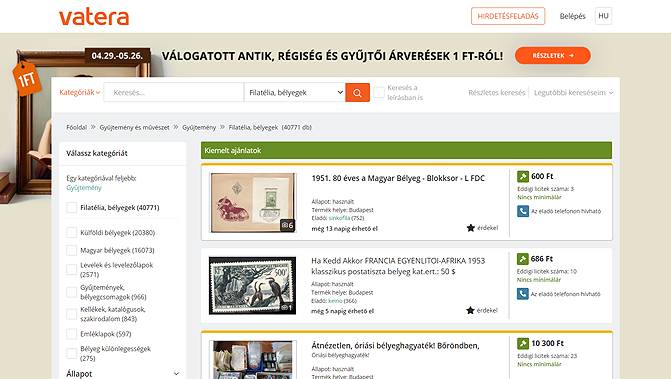 A Vatera több mint 20 éve várja a bélyegek iránt érdeklődő vásárlókat és eladókat. Az online piactéren jelenleg több mint 40 000 magyar és külföldi bélyeg, illetve filatéliai hirdetés található. A termékek között találhatunk aukción, licitálással, illetve azonnal, fix áron megvásárolható darabokat is. Érdemes rendszeresen látogatni az oldalt, mert folyamatosan kerülnek fel az új hirdetések.