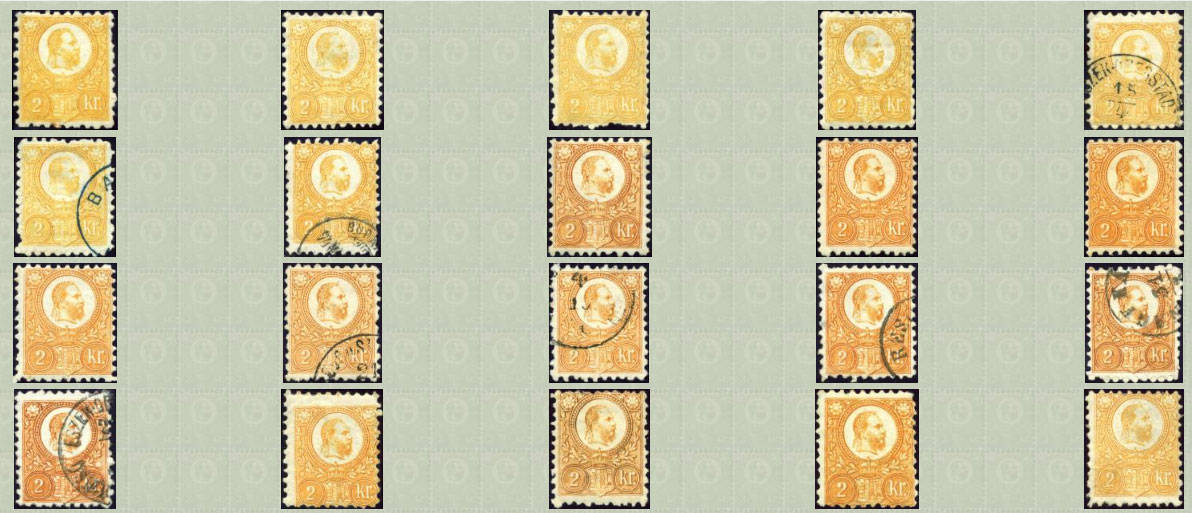 1871-es Kő- és réznyomatok 2 kr értékének színváltozataiForrás: Bélyegmúzeum |